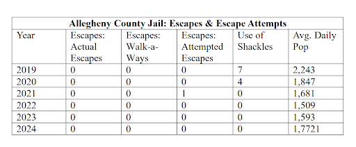 Fellow council member and vigilant Jail Oversight Board member Bethany Hallam also reminded council members of data ALC had previously provided on escape attempts from ACJ. Since 2019, there has been only one attempted escape, and none in the years following the ban on leg shackles (see Table 2). The numbers clearly belied the petition authors’ claim that the return of leg shackles were necessary for public safety.