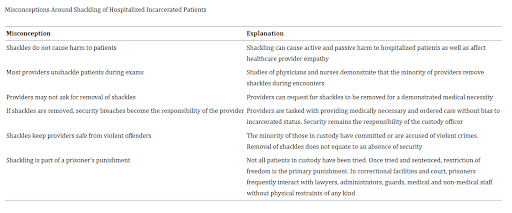 ALC Court Watch intern Kayla King, a Summa Cum Laude graduate at the University of Pittsburgh Criminal Justice and Law Program, gave public comment on the leg shackles petition, , “Where we focus on evidence-based practices in corrections and law enforcement agencies, anecdotal stories – tales from corrections officers – do not, cannot, and will not outweigh the mass of evidence that attest that leg shackling during hospital transports is largely unnecessary. Medical staff can and will utilize leg shackles. That is their prerogative as a hospital or medical practitioner. It is not standard practice for jail and correctional facilities people to do this.” A 2022 Journal of Internal Medicine article, “Shackling in the Hospital” makes clear that when people do arrive in leg shackles, their use is harmful and unnecessary from a public safety perspective (see Table 1).